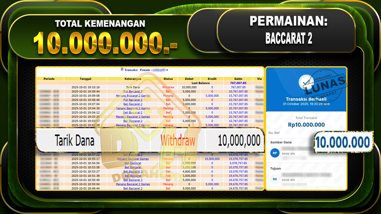 Bukti JP BACCARAT 2 GAMES- ucapkan selamat kepada user id arkhxxxxx atas kemenangan di BACCARAT 2 GAMES dengan total kemenangan Rp.10.000.000,- . Yang pasti nya langsung LUNAS sesuai bukti ya bosku. Dorahoki nih bosku berapapun akan tetap kami bayar lunas ya bosku.