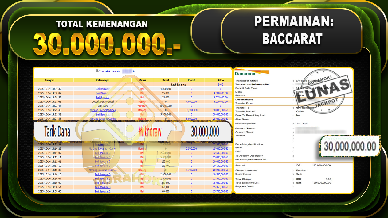 Bukti JP BACCARAT 3 GAMES – ucapkan selamat kepada user id arkhxxxxx atas kemenangan di BACCARAT 3 GAMES   dengan total kemenangan Rp.25.000.000,- . Yang pasti nya langsung LUNAS sesuai bukti ya bosku. Dorahoki nih bosku berapapun akan tetap kami bayar lunas ya bosku.