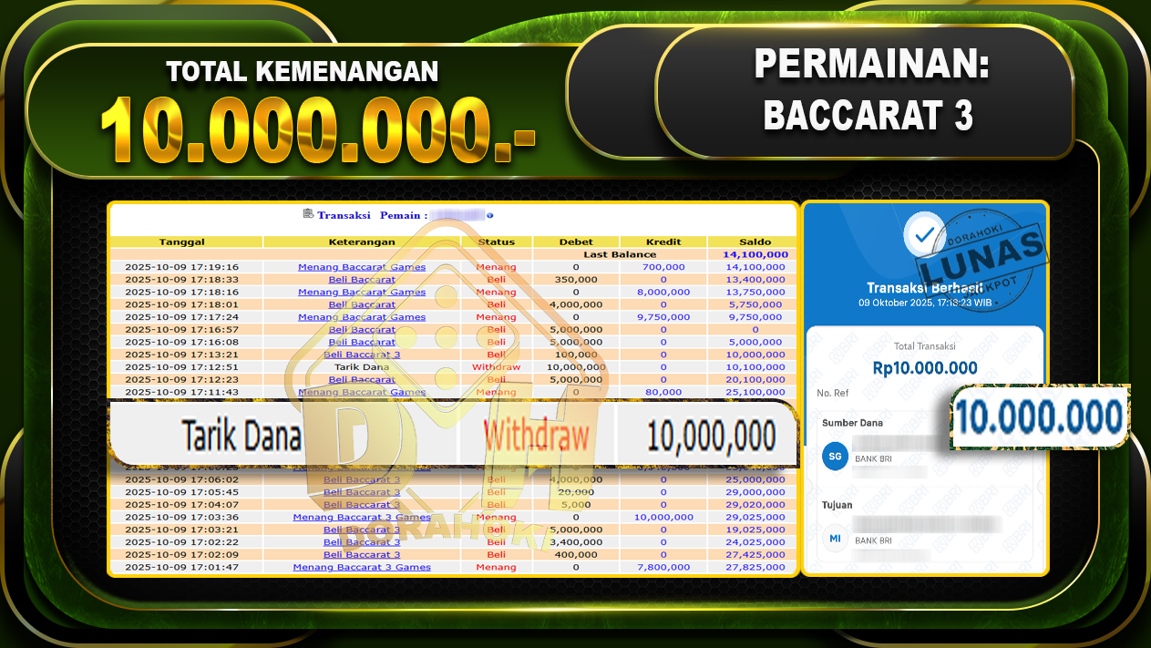 Bukti JP BACCARAT 3 GAMES – ucapkan selamat kepada user id arkhxxxx atas kemenangan di BACCARAT 3 GAMES   dengan total kemenangan Rp.10.000.000,- . Yang pasti nya langsung LUNAS sesuai bukti ya bosku. Dorahoki nih bosku berapapun akan tetap kami bayar lunas ya bosku.