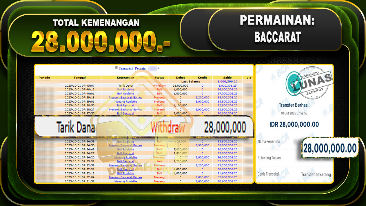 Bukti JP Baccarat – ucapkan selamat kepada user id asuxxxx atas kemenangan di Baccarat dengan total kemenangan Rp.28.000.000- . Yang pasti nya langsung LUNAS sesuai bukti ya bosku. Dorahoki nih bosku berapapun akan tetap kami bayar lunas ya bosku.