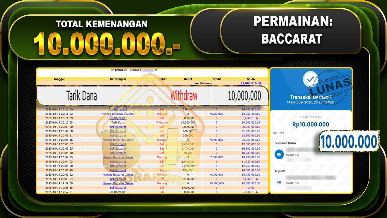 Bukti JP Baccarat – ucapkan selamat kepada user id arkxxxxxx atas kemenangan di Baccarat dengan total kemenangan Rp.10.000.000- . Yang pasti nya langsung LUNAS sesuai bukti ya bosku. Dorahoki nih bosku berapapun akan tetap kami bayar lunas ya bosku.