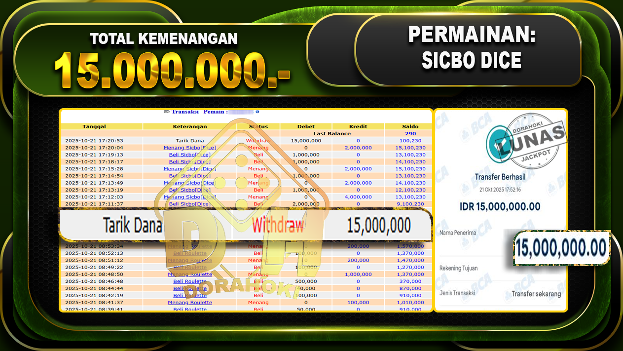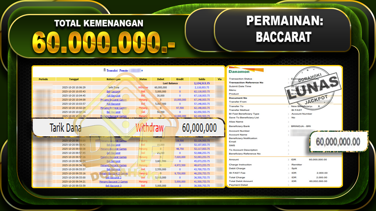 Bukti JP Baccarat – ucapkan selamat kepada user id arkxxxxxxx atas kemenangan di Baccarat dengan total kemenangan Rp.60.000.000,-Yang pasti nya langsung LUNAS sesuai bukti ya bosku. Dorahoki nih bosku berapapun akan tetap kami bayar lunas ya bosku.