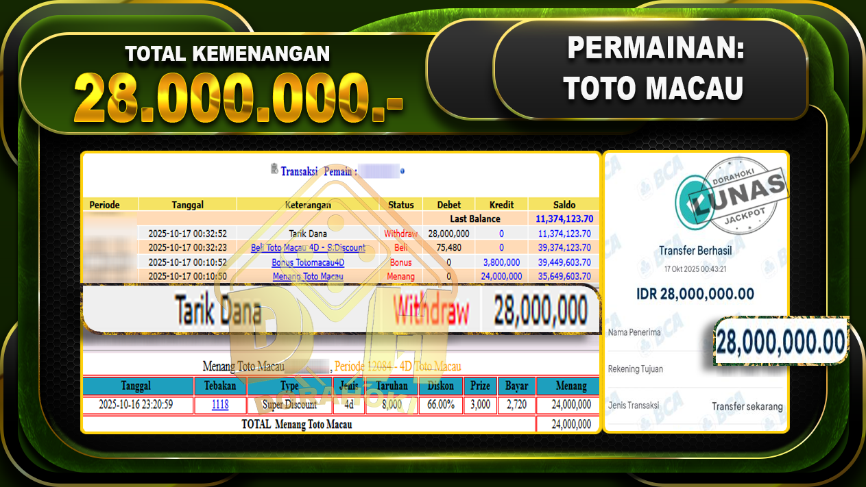 Bukti JP Togel Totomacau – Yang kami berikan ini sah dan real tanpa di rekayasa bosku dan hanya bertujuan untuk meningkatkan kepercayaan member kami dan memberikan kenyamanan saat bermain jadi bosku tidak perlu khawatir MENANG BERAPAPUN PASTI KAMI BAYAR LUNAS!!