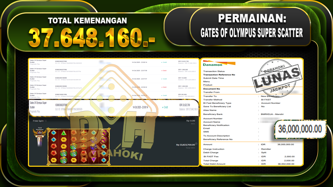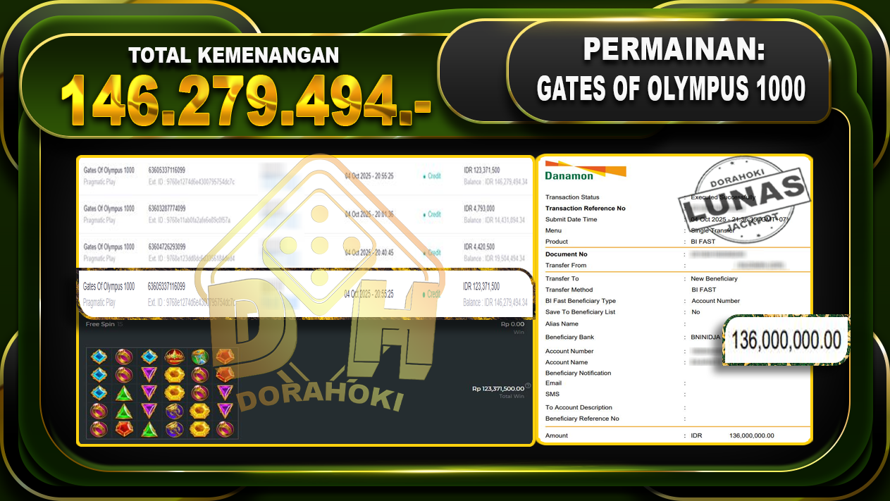 Bukti JP Gates Of Olympus 1000 – ucapkan selamat kepada user id marxxxxx atas kemenangan di  Gates Of Olympus 1000 dengan total kemenangan Rp.146,279.494,- Yang pasti nya langsung LUNAS sesuai bukti ya bosku. Dorahoki nih bosku berapapun akan tetap kami bayar lunas ya bosku