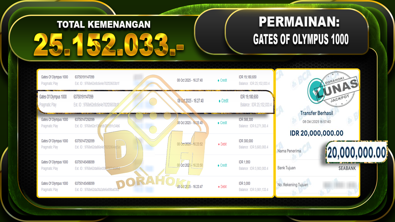 Bukti JP Gates Of Olympus 1000 – ucapkan selamat kepada user id grexxxxxx atas kemenangan di Gates Of Olympus 1000 dengan total kemenangan Rp.25,152.033,- Yang pasti nya langsung LUNAS sesuai bukti ya bosku. Dorahoki nih bosku berapapun akan tetap kami bayar lunas ya bosku