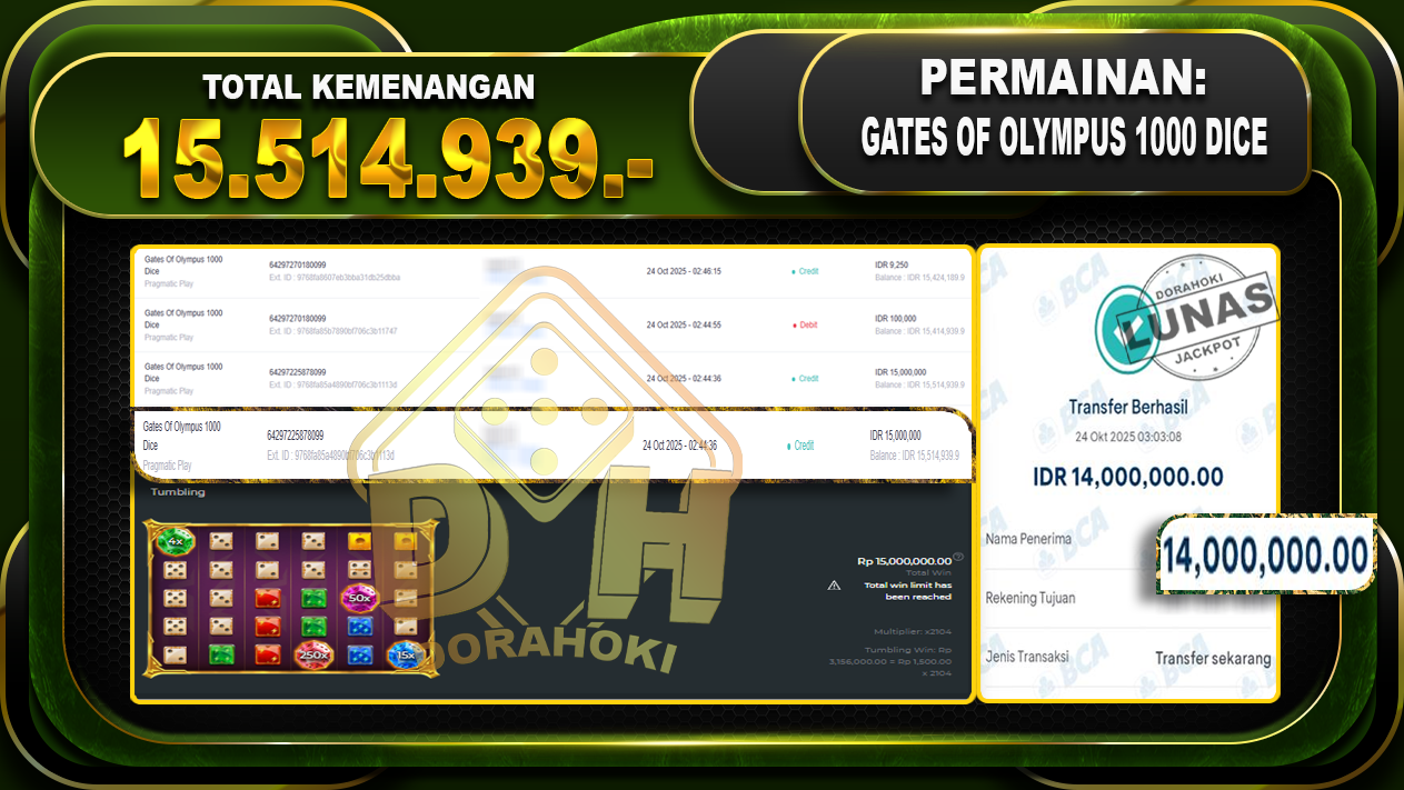 Bukti JP Gates Of Olympus 1000 – ucapkan selamat kepada user id Satrixxx atas kemenangan di Gates Of Olympus 1000 dengan total kemenangan Rp.14.300.000,- . Yang pasti nya langsung LUNAS sesuai bukti ya bosku. Dorahoki nih bosku berapapun akan tetap kami bayar lunas ya bosku.