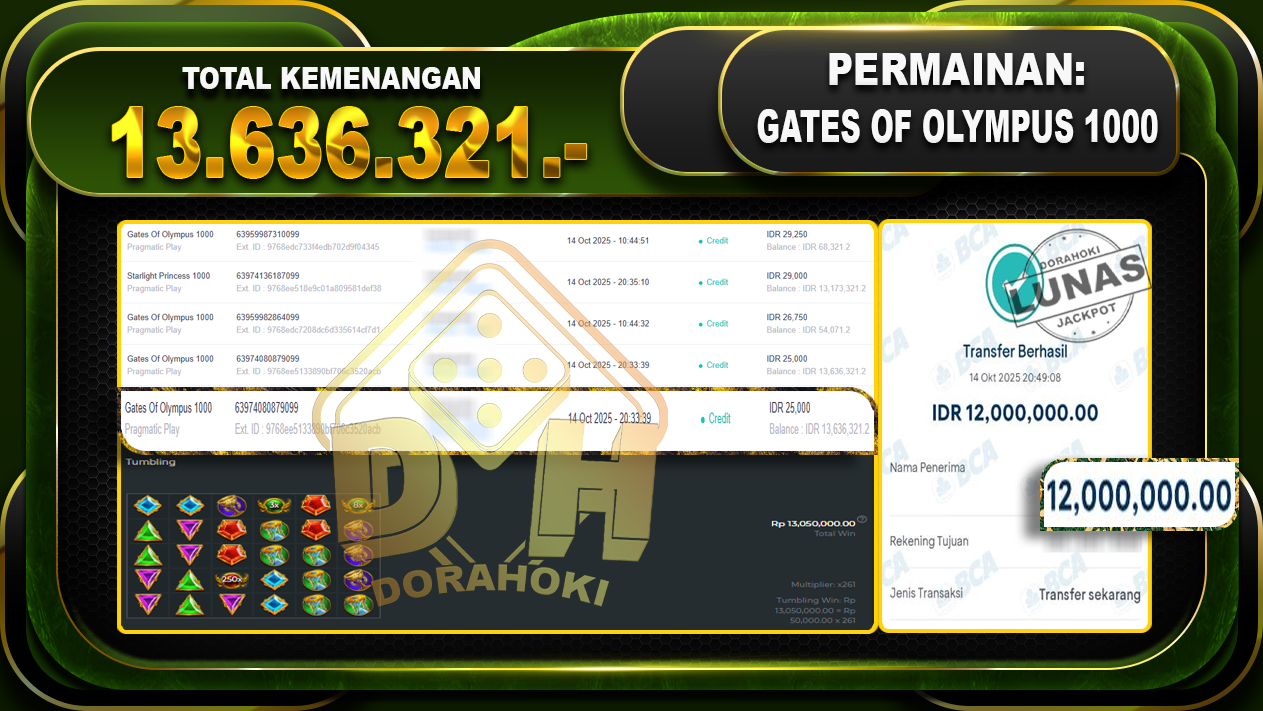 Bukti JP Gates Of Olympus 1000 – ucapkan selamat kepada user id komxxxxx atas kemenangan di Gates Of Olympus 1000 dengan total kemenangan Rp.13,636,321,- Yang pasti nya langsung LUNAS sesuai bukti ya bosku. Dorahoki nih bosku berapapun akan tetap kami bayar lunas ya bosku