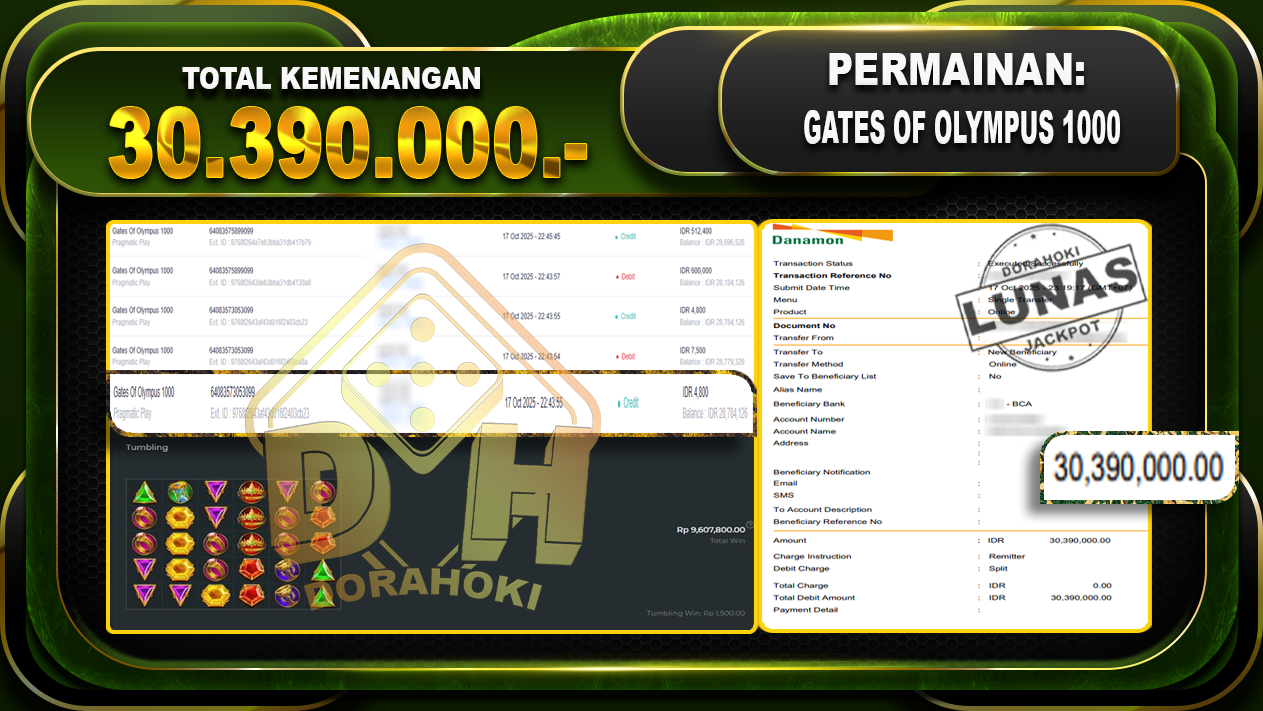 Bukti JP Gates Of Olympus 1000 – ucapkan selamat kepada user id varxxxxx atas kemenangan di Gates Of Olympus 1000 dengan total kemenangan Rp.30,390,000,- Yang pasti nya langsung LUNAS sesuai bukti ya bosku. Dorahoki nih bosku berapapun akan tetap kami bayar lunas ya bosku