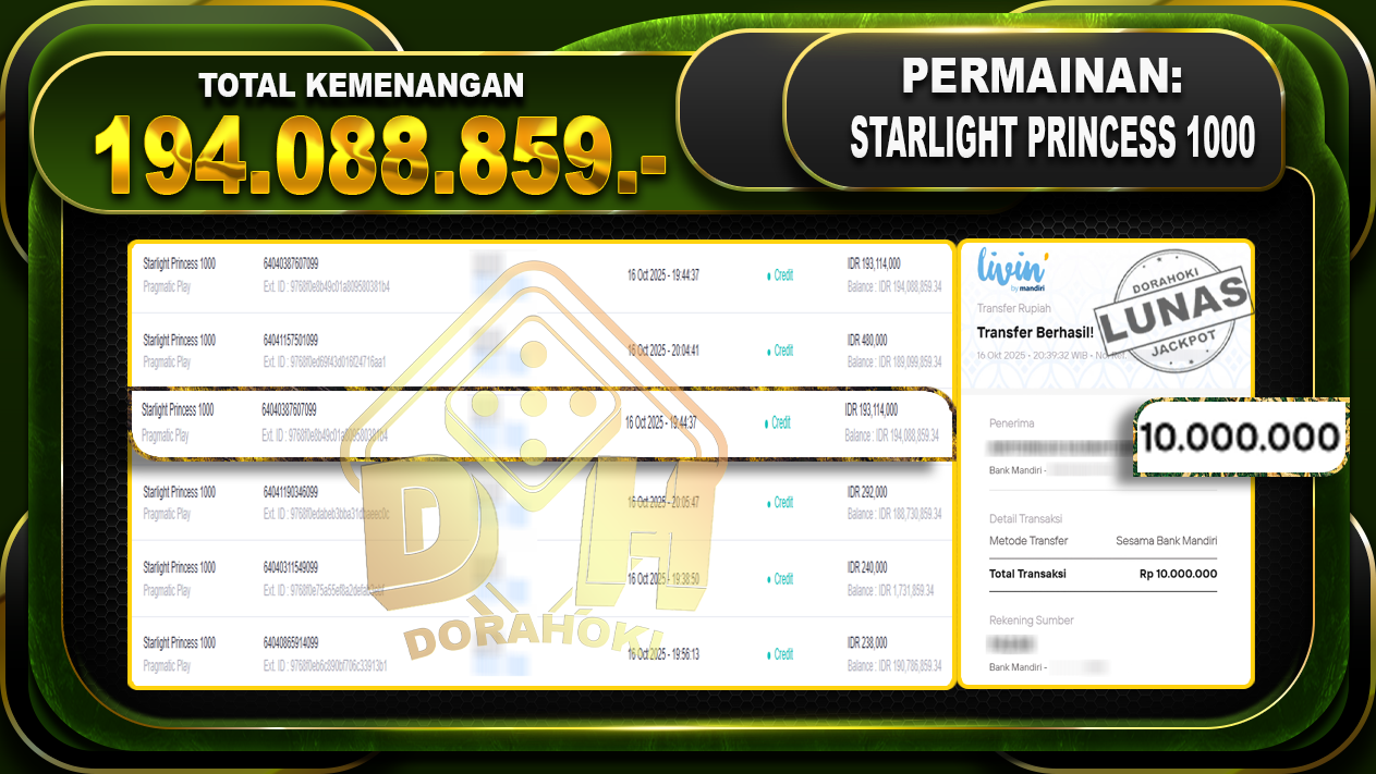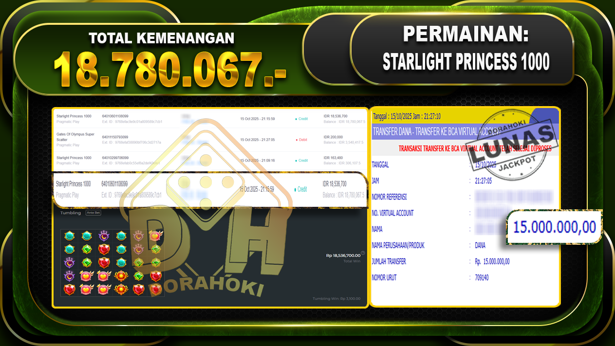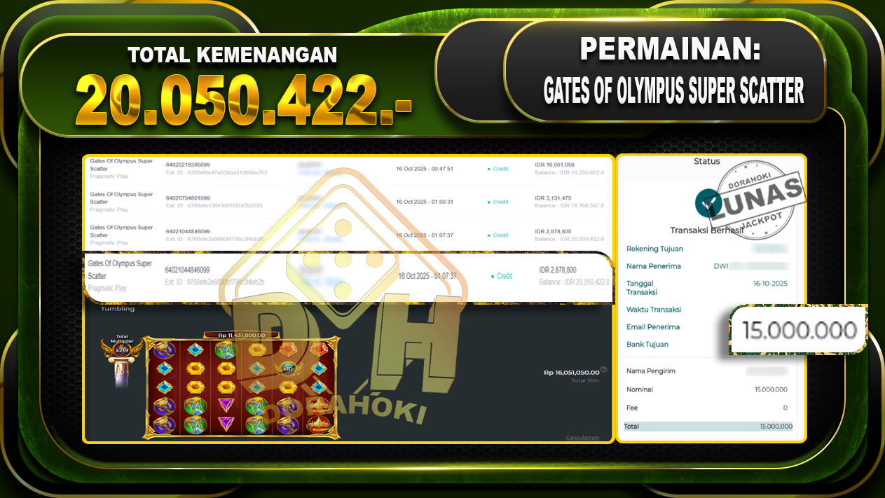 Bukti JP Gates Of Olympus Super Scatter – ucapkan selamat kepada user id dorxxxxx atas kemenangan di Gates Of Olympus Super Scatter dengan total kemenangan Rp.20.050.422,- Yang pasti nya langsung LUNAS sesuai bukti ya bosku. Dorahoki nih bosku berapapun akan tetap kami bayar lunas ya bosku