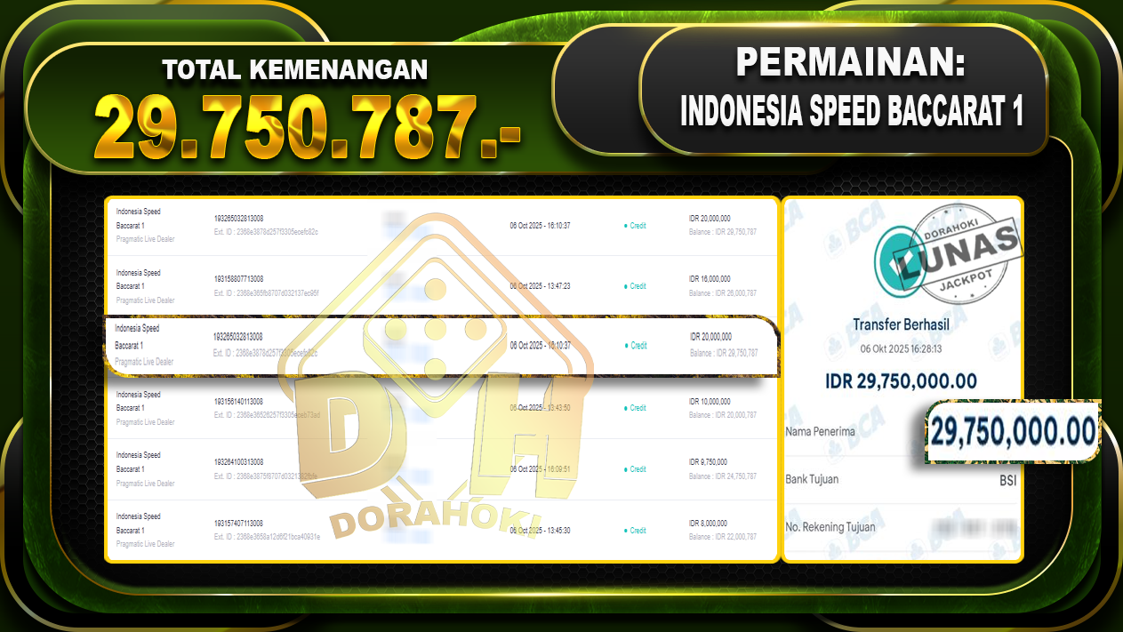 Bukti JP Indonesia Speed Baccarat 1 – ucapkan selamat kepada user id sindxxxxx atas kemenangan di Indonesia Speed Baccarat 1 dengan total kemenangan Rp.29.750.787,- Yang pasti nya langsung LUNAS sesuai bukti ya bosku. Dorahoki nih bosku berapapun akan tetap kami bayar lunas ya bosku
