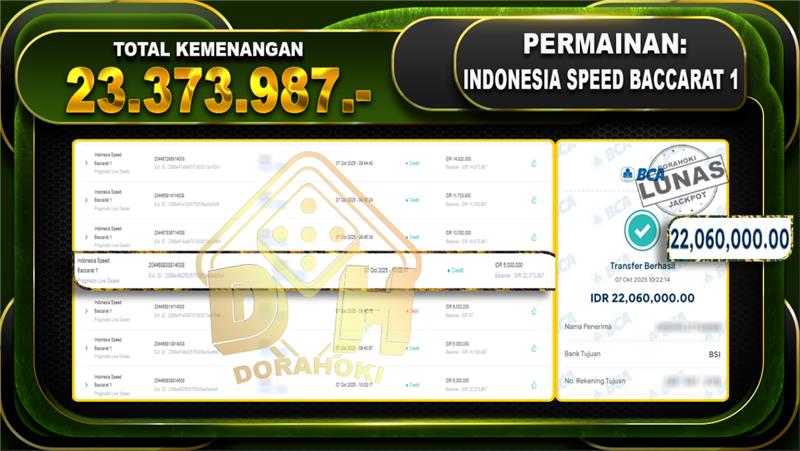 Bukti JP Indonesia Speed Baccarat 1 – ucapkan selamat kepada user id Sinxxxxx atas kemenangan di Indonesia Speed Baccarat 1 dengan total kemenangan Rp.22.373.987,- Yang pasti nya langsung LUNAS sesuai bukti ya bosku. Dorahoki nih bosku berapapun akan tetap kami bayar lunas ya bosku