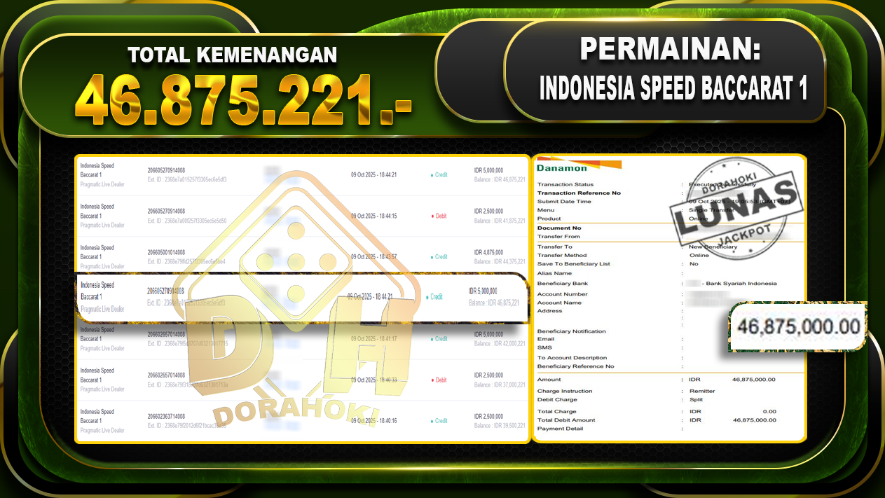 Bukti JP Indonesia Speed Baccarat 1 – ucapkan selamat kepada user id Sindxxxx atas kemenangan di Indonesia Speed Baccarat 1 dengan total kemenangan Rp.46.875.221,- Yang pasti nya langsung LUNAS sesuai bukti ya bosku. Dorahoki nih bosku berapapun akan tetap kami bayar lunas ya bosku