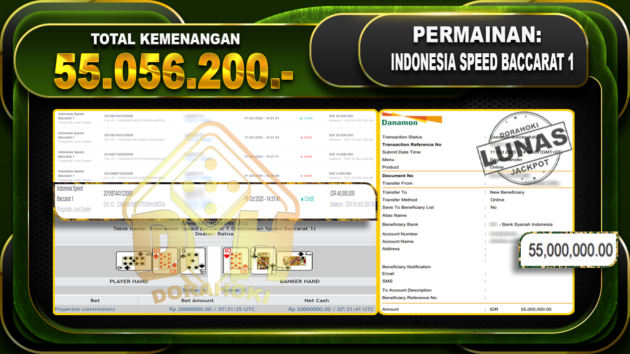Bukti JP Indonesia Speed Baccarat 1 – ucapkan selamat kepada user id prakxxxxx atas kemenangan di Indonesia Speed Baccarat 1 dengan total kemenangan Rp.55.056.200,- Yang pasti nya langsung LUNAS sesuai bukti ya bosku. Dorahoki nih bosku berapapun akan tetap kami bayar lunas ya bosku