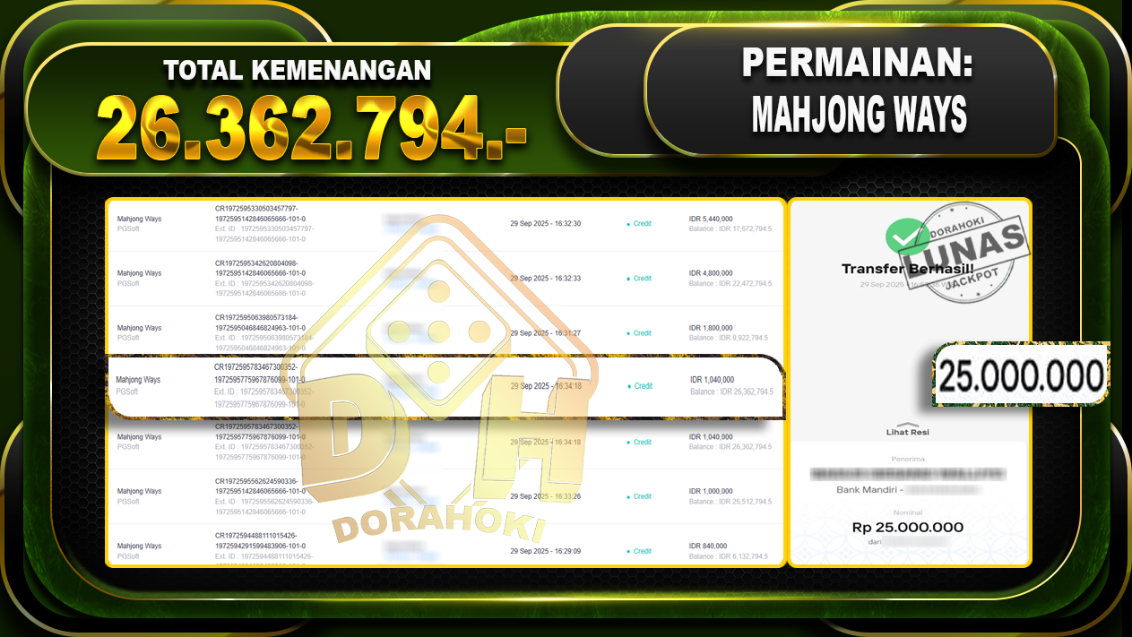 Bukti JP Mahjong Ways – ucapkan selamat kepada user id bagxxxxxx atas kemenangan di Mahjong Ways dengan total kemenangan Rp.26.362.794,- Yang pasti nya langsung LUNAS sesuai bukti ya bosku. Dorahoki nih bosku berapapun akan tetap kami bayar lunas ya bosku