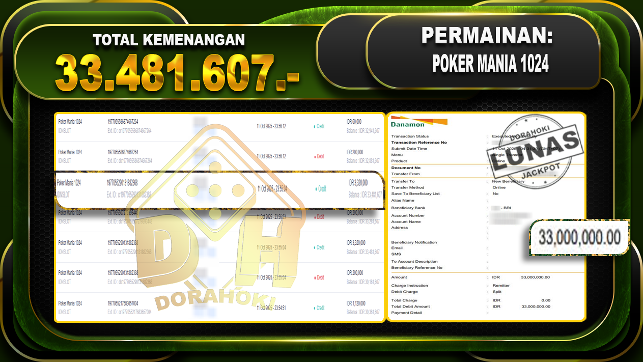 Bukti JP Poker Mania 1024 – ucapkan selamat kepada user id rahxxxxx atas kemenangan di Poker Mania 1024 dengan total kemenangan Rp.33,481,607,- Yang pasti nya langsung LUNAS sesuai bukti ya bosku. Dorahoki nih bosku berapapun akan tetap kami bayar lunas ya bosku