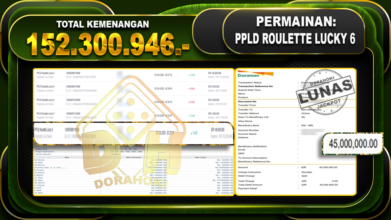 Bukti JP PPLD Roulette Lucky 6 – ucapkan selamat kepada user id suwxxxxx atas kemenangan di PPLD Roulette Lucky 6 dengan total kemenangan Rp.152.300.946,- Yang pasti nya langsung LUNAS sesuai bukti ya bosku. Dorahoki nih bosku berapapun akan tetap kami bayar lunas ya bosku.