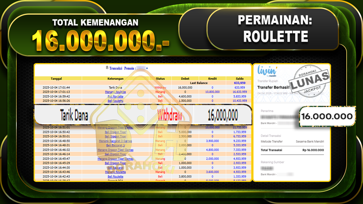 Bukti JP Roulette – ucapkan selamat kepada user id slisxxxxx atas kemenangan di  Roulette  dengan total kemenangan Rp.16.000.000,- Yang pasti nya langsung LUNAS sesuai bukti ya bosku. Dorahoki nih bosku berapapun akan tetap kami bayar lunas ya bosku.