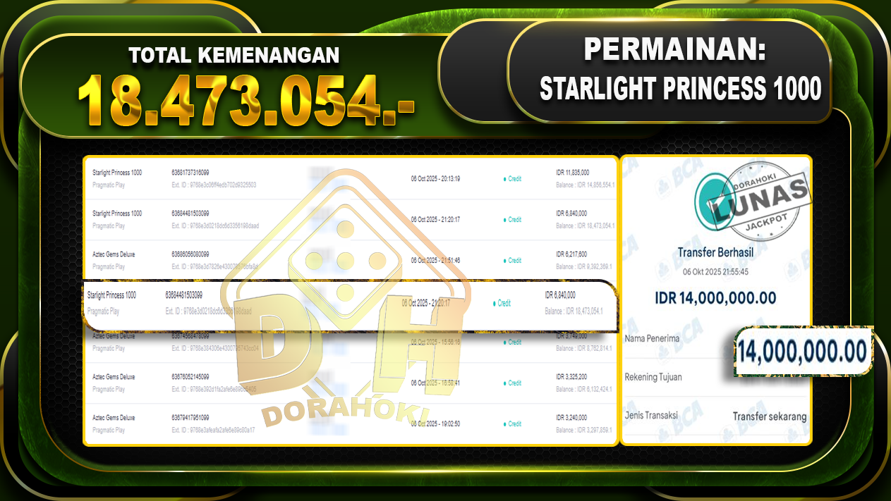 Bukti JP Starlight Princess 1000 – ucapkan selamat kepada user id menxxxxx atas kemenangan di Starlight Princess 1000 dengan total kemenangan Rp.18,473,054,- Yang pasti nya langsung LUNAS sesuai bukti ya bosku. Dorahoki nih bosku berapapun akan tetap kami bayar lunas ya bosku