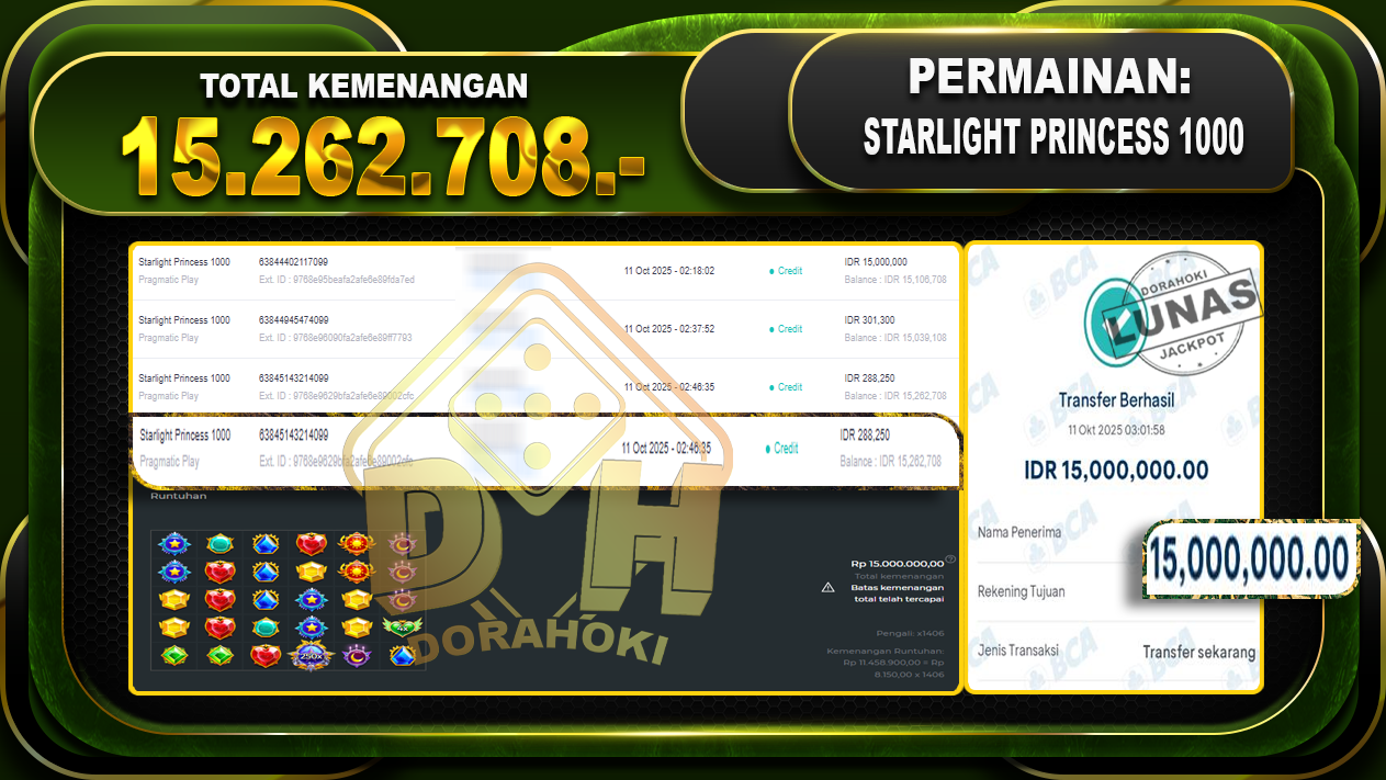 Bukti JP Starlight Princess 1000 – ucapkan selamat kepada user id budxxxxxx atas kemenangan di Starlight Princess 1000 dengan total kemenangan Rp.15,262,708,- Yang pasti nya langsung LUNAS sesuai bukti ya bosku. Dorahoki nih bosku berapapun akan tetap kami bayar lunas ya bosku