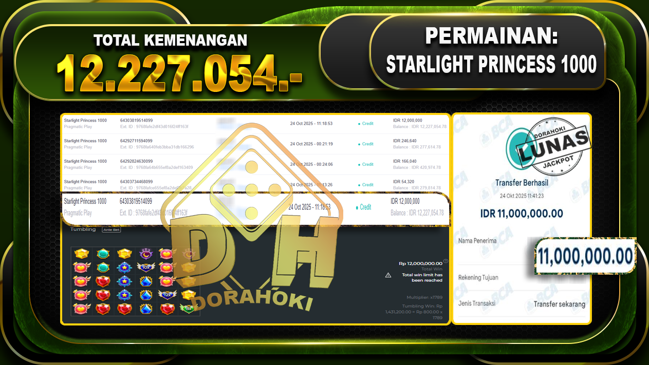 Bukti JP Starlight Princess 1000 – ucapkan selamat kepada user id gabxxxxx atas kemenangan di Starlight Princess 1000 dengan total kemenangan Rp.12,227,054,- Yang pasti nya langsung LUNAS sesuai bukti ya bosku. Dorahoki nih bosku berapapun akan tetap kami bayar lunas ya bosku