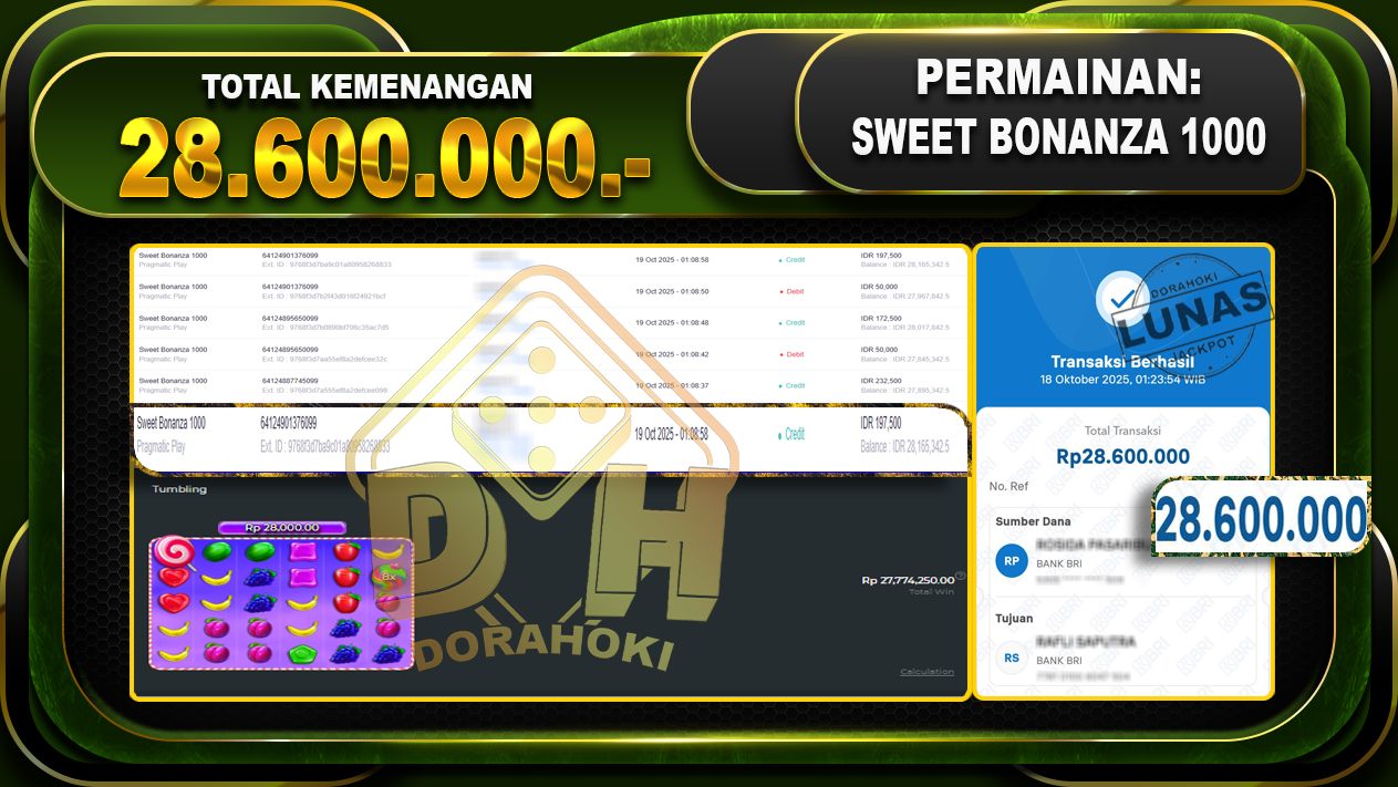 Bukti JP SWEET BONANZA 1000 – ucapkan selamat kepada user id Unnxxx atas kemenangan di SWEET BONANZA 1000 dengan total kemenangan Rp.55.065.267,- . Yang pasti nya langsung LUNAS sesuai bukti ya bosku. Dorahoki nih bosku berapapun akan tetap kami bayar lunas ya bosku.