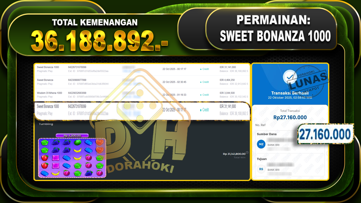 Bukti JP Sweet Bonanza 1000 – ucapkan selamat kepada user id pratxxxxx atas kemenangan di Sweet Bonanza 1000 dengan total kemenangan Rp.36.188.892,- Yang pasti nya langsung LUNAS sesuai bukti ya bosku. Dorahoki nih bosku berapapun akan tetap kami bayar lunas ya bosku.