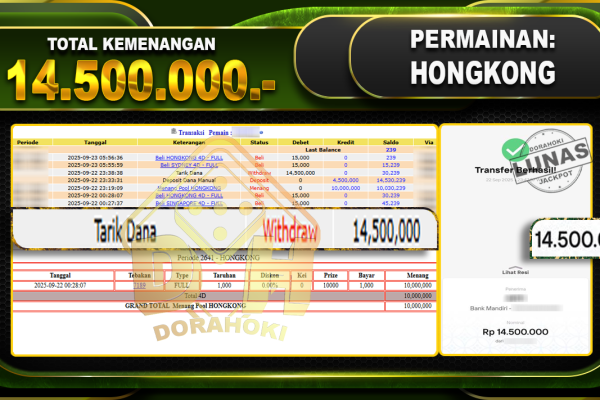 Bukti JP TOGEL HONGKONG – ucapkan selamat kepada user id chxxx atas kemenangan di TOGEL HONGKONG dengan total kemenangan Rp.15,000,000 ,- . Yang pasti nya langsung LUNAS sesuai bukti ya bosku. Dorahoki nih bosku berapapun akan tetap kami bayar lunas ya bosku. Kami mengucapkan Terima Kasih telah mempercayakan DORAHOKI sebagai Bandar Online pilihan dalam bermain judi…