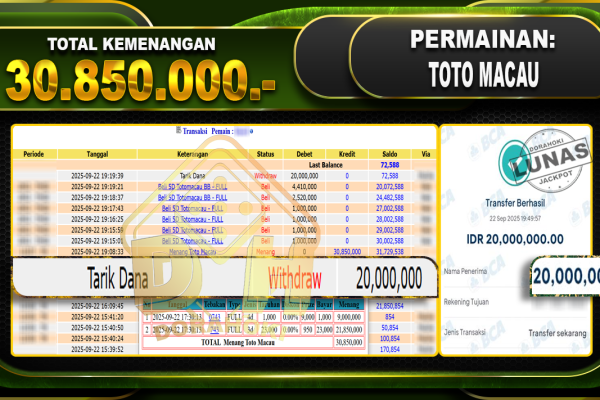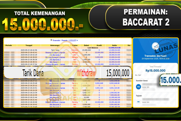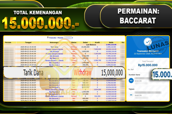 Bukti JP BACCARAT 3 GAMES – ucapkan selamat kepada user id arkhxxxxx atas kemenangan di BACCARAT 3 GAMES dengan total kemenangan Rp.15.000.000,- . Yang pasti nya langsung LUNAS sesuai bukti ya bosku. Dorahoki nih bosku berapapun akan tetap kami bayar lunas ya bosku.