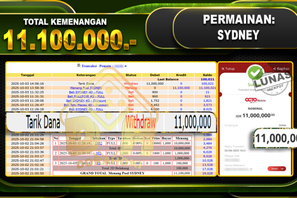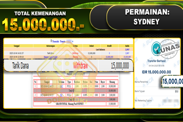 Bukti JP TOGEL SYDNEY – ucapkan selamat kepada user id sunxxxxx atas kemenangan di TOGEL SYDNEY dengan total kemenangan Rp.14,500,000,- Yang pasti nya langsung LUNAS sesuai bukti ya bosku. Dorahoki nih bosku berapapun akan tetap kami bayar lunas ya bosku