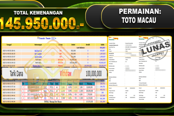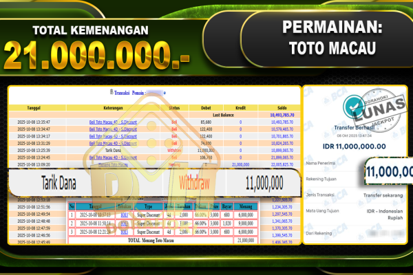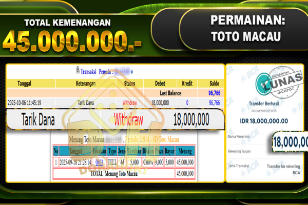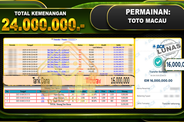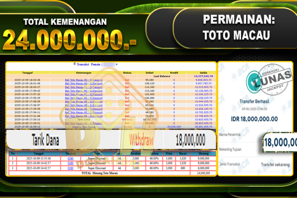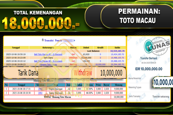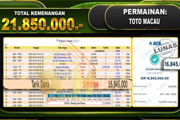 Bukti JP TOGEL TOTO MACAU – ucapkan selamat kepada user id busxxx atas kemenangan di TOGEL TOTO MACAU dengan total kemenangan Rp.19,950,000,- Yang pasti nya langsung LUNAS sesuai bukti ya bosku. Dorahoki nih bosku berapapun akan tetap kami bayar lunas ya bosku