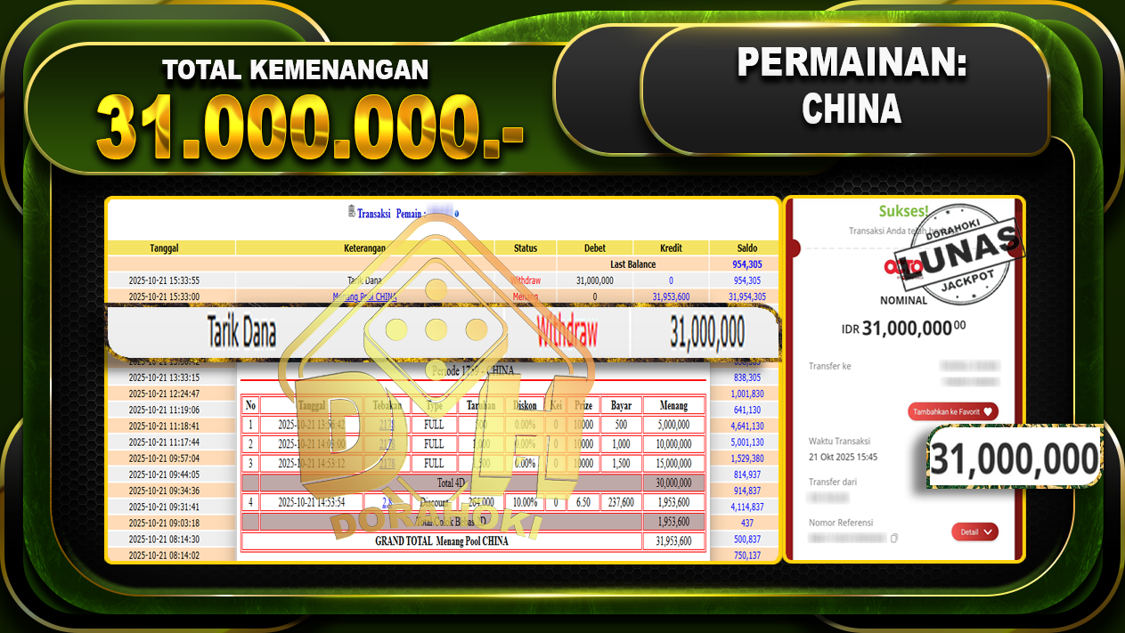 Bukti JP TOGEL CHINA- Yang kami berikan ini sah dan real tanpa di rekayasa bosku dan hanya bertujuan untuk meningkatkan kepercayaan member kami dan memberikan kenyamanan saat bermain jadi bosku tidak perlu khawatir MENANG BERAPAPUN PASTI KAMI BAYAR LUNAS!!