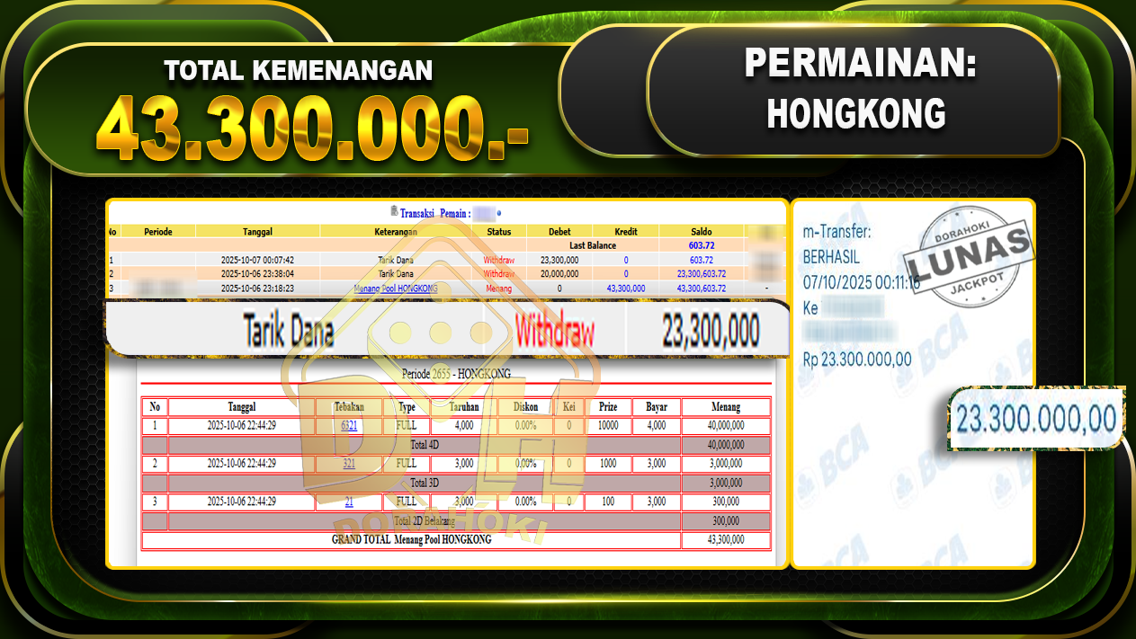 Bukti JP TOGEL HONGKONG – ucapkan selamat kepada user id Febxxxxx atas kemenangan di TOGEL HONGKONG dengan total kemenangan Rp.43,000,000,- . Yang pasti nya langsung LUNAS sesuai bukti ya bosku. Dorahoki nih bosku berapapun akan tetap kami bayar lunas ya bosku.