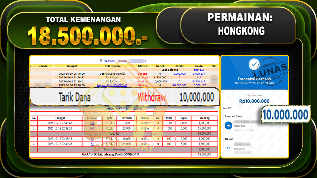 Bukti JP TOGEL HONGKONG – Yang kami berikan ini sah dan real tanpa di rekayasa bosku dan hanya bertujuan untuk meningkatkan kepercayaan member kami dan memberikan kenyamanan saat bermain jadi bosku tidak perlu khawatir MENANG BERAPAPUN PASTI KAMI BAYAR LUNAS!!