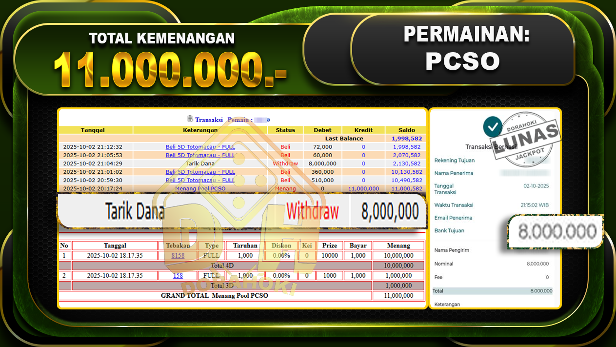 Bukti JP TOGEL PCSO – Yang kami berikan ini sah dan real tanpa di rekayasa bosku dan hanya bertujuan untuk meningkatkan kepercayaan member kami dan memberikan kenyamanan saat bermain jadi bosku tidak perlu khawatir MENANG BERAPAPUN PASTI KAMI BAYAR LUNAS!!