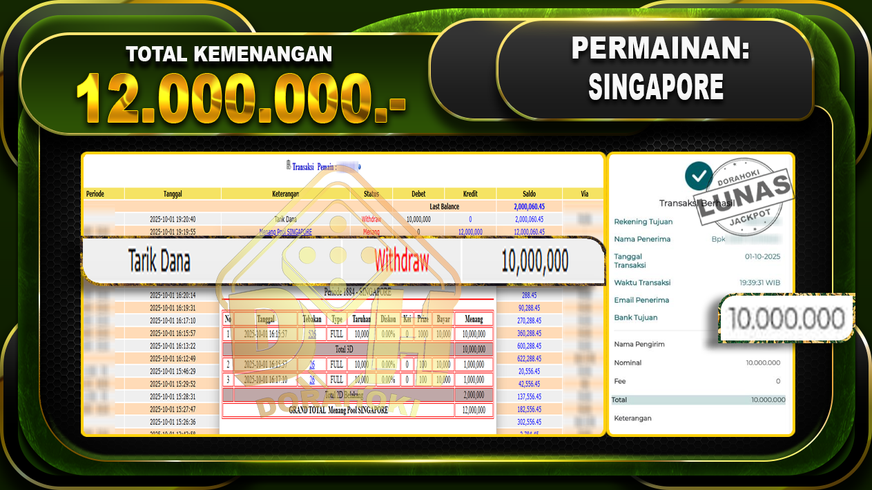 Bukti JP TOGEL SINGAPORE – ucapkan selamat kepada user id Samxxxxx atas kemenangan di TOGEL SINGAPORE dengan total kemenangan Rp.12,000,000,- Yang pasti nya langsung LUNAS sesuai bukti ya bosku. Dorahoki nih bosku berapapun akan tetap kami bayar lunas ya bosku