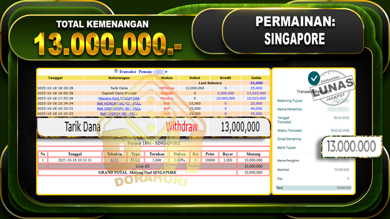 Bukti JP TOGEL SINGAPORE – ucapkan selamat kepada user id hinxxx atas kemenangan di TOGEL SINGAPORE dengan total kemenangan Rp.13,000,000,- Yang pasti nya langsung LUNAS sesuai bukti ya bosku. Dorahoki nih bosku berapapun akan tetap kami bayar lunas ya bosku
