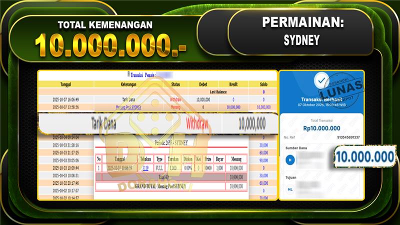 Bukti JP TOGEL SYDNEY – ucapkan selamat kepada user id Winxxx atas kemenangan di TOGEL SYDNEY dengan total kemenangan Rp.10,000,000,- Yang pasti nya langsung LUNAS sesuai bukti ya bosku. Dorahoki nih bosku berapapun akan tetap kami bayar lunas ya bosku