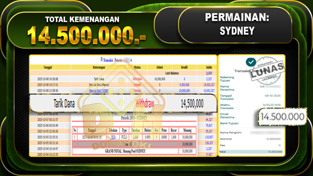 Bukti JP TOGEL SYDNEY – ucapkan selamat kepada user id askxxxx atas kemenangan di TOGEL SYDNEY dengan total kemenangan Rp.14,500,000,- Yang pasti nya langsung LUNAS sesuai bukti ya bosku. Dorahoki nih bosku berapapun akan tetap kami bayar lunas ya bosku