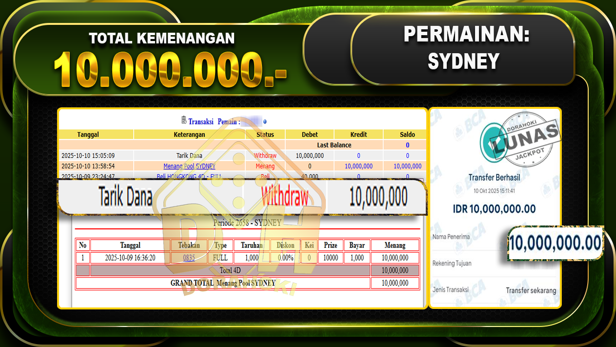 Bukti JP TOGEL SYDNEY – ucapkan selamat kepada user id benxxxxx atas kemenangan di TOGEL SYDNEY dengan total kemenangan Rp.10,000,000,- Yang pasti nya langsung LUNAS sesuai bukti ya bosku. Dorahoki nih bosku berapapun akan tetap kami bayar lunas ya bosku