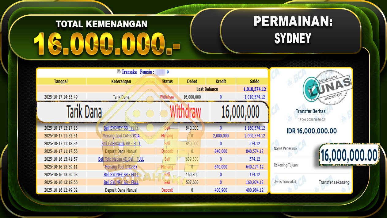Bukti JP TOGEL SYDNEY – ucapkan selamat kepada user id yatxxxxx atas kemenangan di  TOGEL SYDNEY dengan total kemenangan Rp.16,000,000,- Yang pasti nya langsung LUNAS sesuai bukti ya bosku. Dorahoki nih bosku berapapun akan tetap kami bayar lunas ya bosku