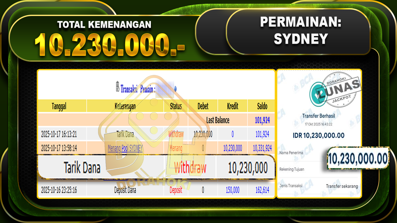 Bukti JP TOGEL SYDNEY – ucapkan selamat kepada user id bluxxxxx atas kemenangan di TOGEL SYDNEY dengan total kemenangan Rp.10,230,000,- Yang pasti nya langsung LUNAS sesuai bukti ya bosku. Dorahoki nih bosku berapapun akan tetap kami bayar lunas ya bosku