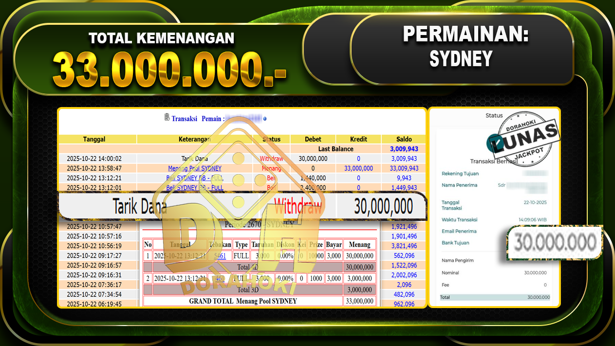 Bukti JP TOGEL SYDNEY – ucapkan selamat kepada user id Kisxxx atas kemenangan di TOGEL SYDNEY dengan total kemenangan Rp.10.500.000,- Yang pasti nya langsung LUNAS sesuai bukti ya bosku. Dorahoki nih bosku berapapun akan tetap kami bayar lunas ya bosku