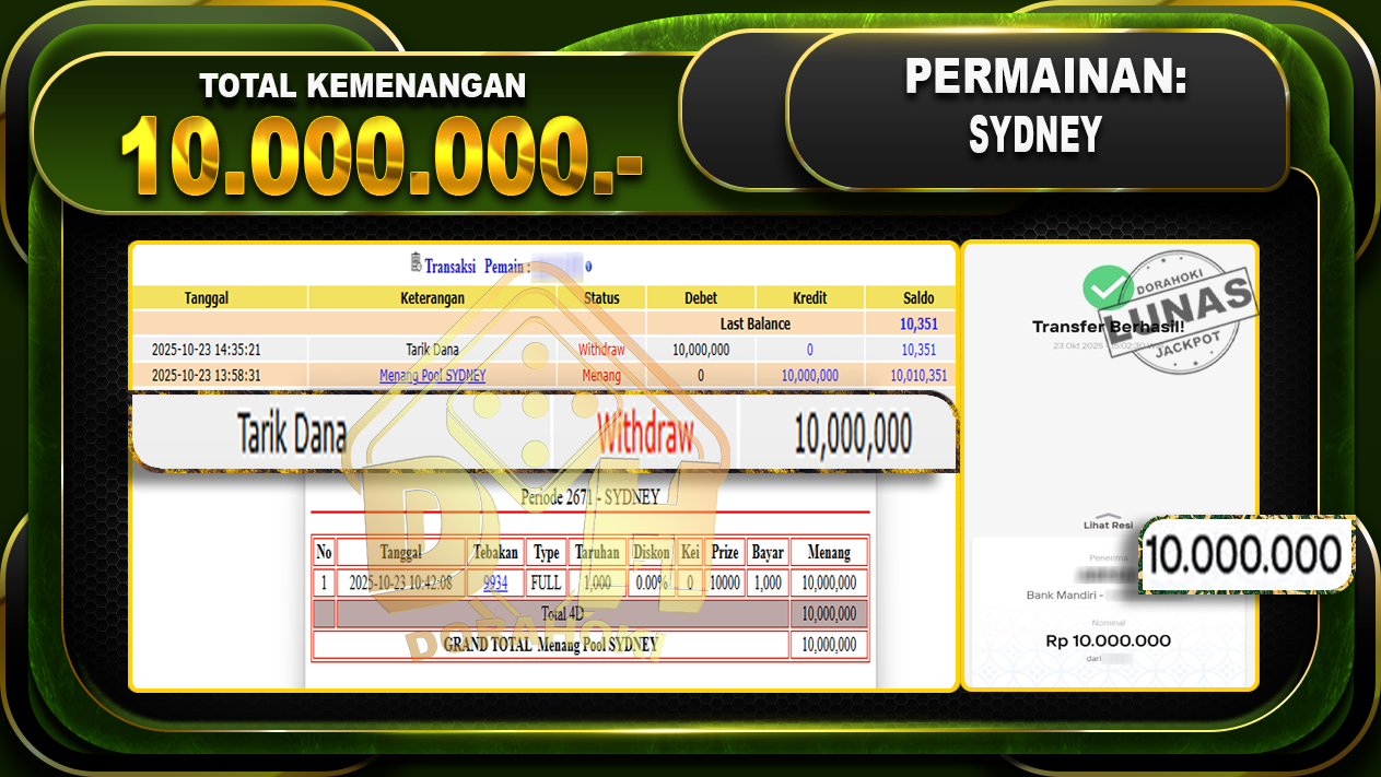 Bukti JP TOGEL SYDNEY – ucapkan selamat kepada user id kakxxxx atas kemenangan di TOGEL SYDNEY dengan total kemenangan Rp.10,000,000,- Yang pasti nya langsung LUNAS sesuai bukti ya bosku. Dorahoki nih bosku berapapun akan tetap kami bayar lunas ya bosku