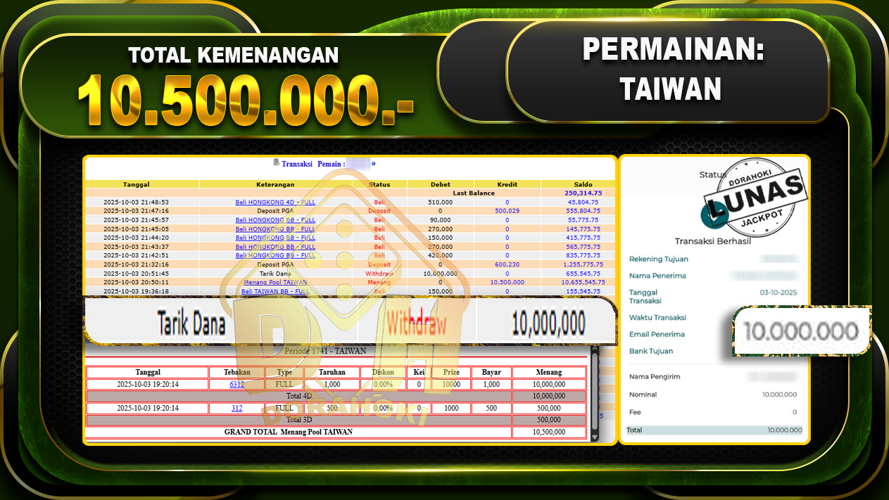 Bukti JP TOGEL TAIWAN – ucapkan selamat kepada user id detxxxxx atas kemenangan di TOGEL TAIWAN dengan total kemenangan Rp.10.500.000,- Yang pasti nya langsung LUNAS sesuai bukti ya bosku. Dorahoki nih bosku berapapun akan tetap kami bayar lunas ya bosku