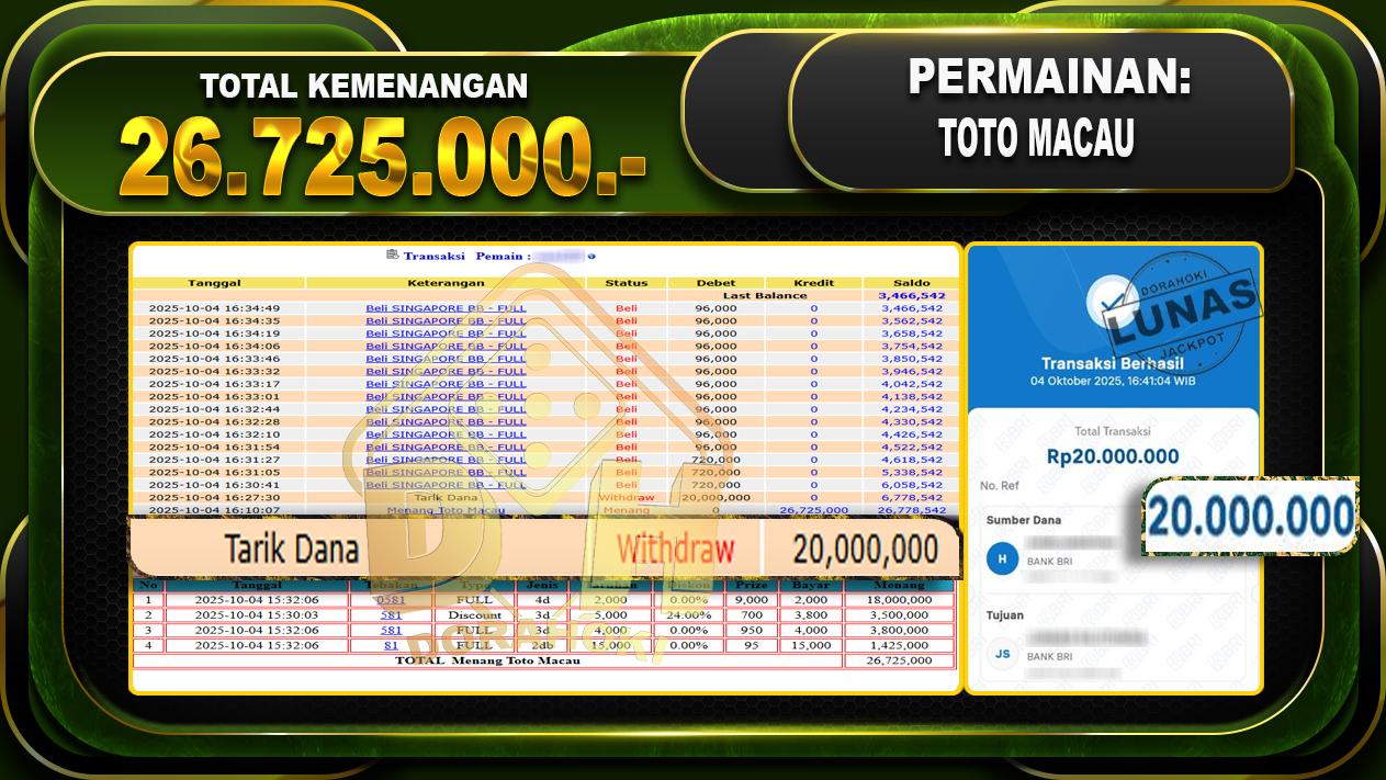 Bukti JP TOGEL TOTO MACAU – Yang kami berikan ini sah dan real tanpa di rekayasa bosku dan hanya bertujuan untuk meningkatkan kepercayaan member kami dan memberikan kenyamanan saat bermain jadi bosku tidak perlu khawatir MENANG BERAPAPUN PASTI KAMI BAYAR LUNAS!!