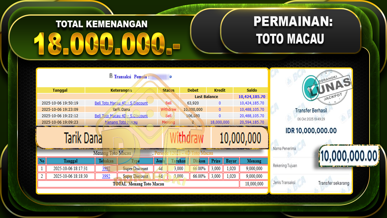 Bukti JP TOGEL TOTO MACAU – ucapkan selamat kepada user id mimxxxxx atas kemenangan di TOGEL TOTO MACAU dengan total kemenangan Rp.18,000,000,- Yang pasti nya langsung LUNAS sesuai bukti ya bosku. Dorahoki nih bosku berapapun akan tetap kami bayar lunas ya bosku