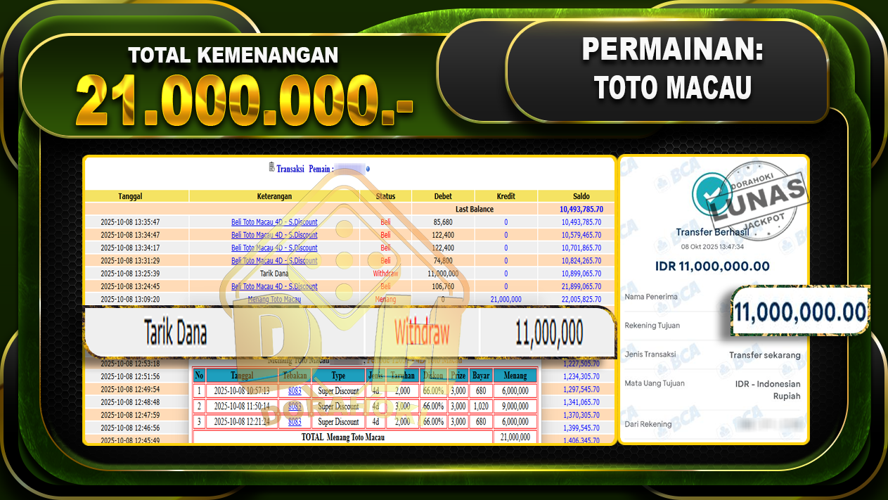 Bukti JP TOGEL TOTO MACAU – ucapkan selamat kepada user id mimxxxxxx atas kemenangan di TOGEL TOTO MACAU dengan total kemenangan Rp.21,000,000,- Yang pasti nya langsung LUNAS sesuai bukti ya bosku. Dorahoki nih bosku berapapun akan tetap kami bayar lunas ya bosku
