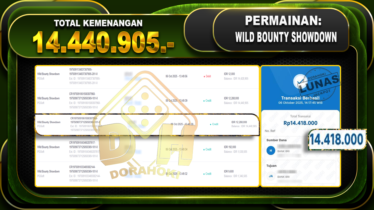 Bukti JP Wild Bounty Showdown – ucapkan selamat kepada user id jefxxxxx atas kemenangan di Wild Bounty Showdown dengan total kemenangan Rp.14,440,905,- Yang pasti nya langsung LUNAS sesuai bukti ya bosku. Dorahoki nih bosku berapapun akan tetap kami bayar lunas ya bosku