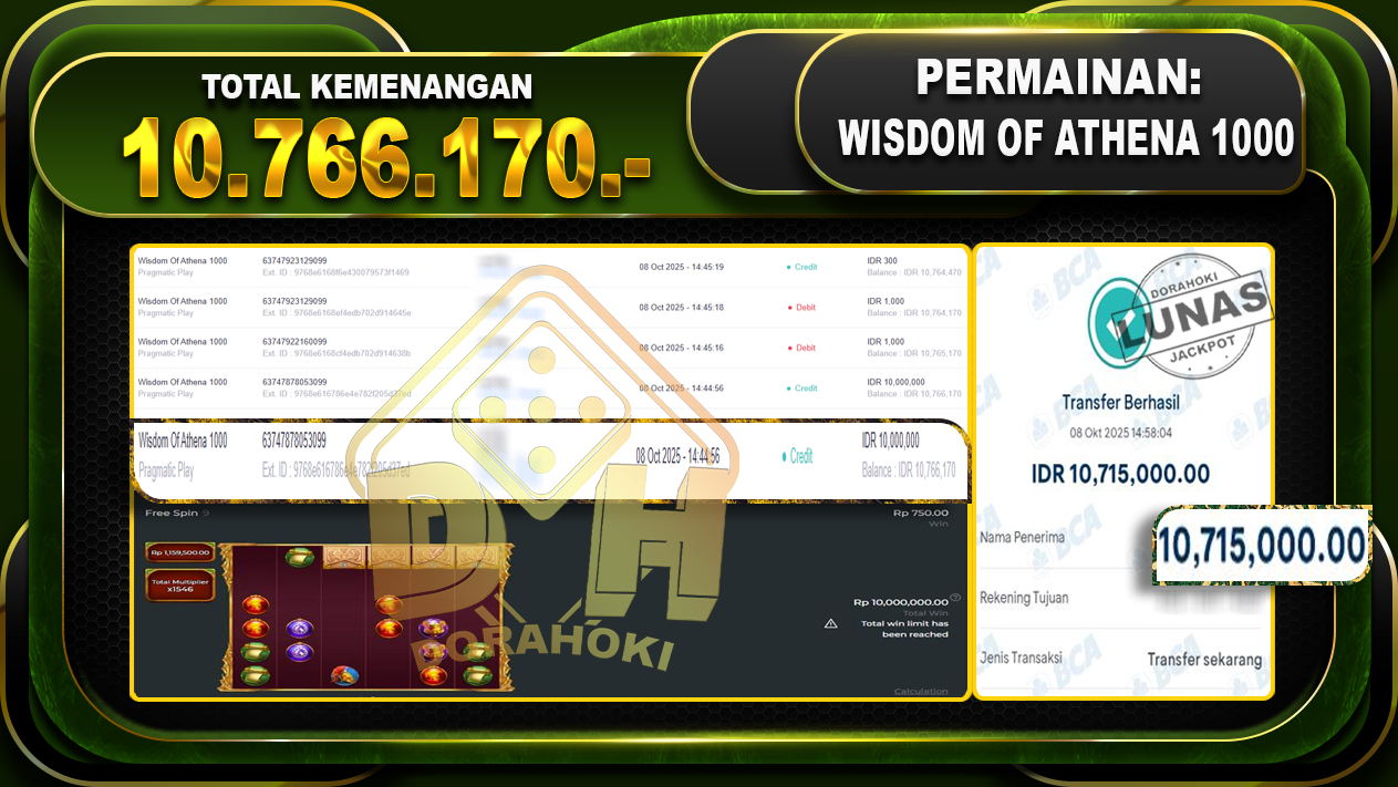 Bukti JP Wisdom Of Athena 1000 – ucapkan selamat kepada user id ranxxxxx atas kemenangan di Wisdom Of Athena 1000 dengan total kemenangan Rp.10.766.170,- Yang pasti nya langsung LUNAS sesuai bukti ya bosku. Dorahoki nih bosku berapapun akan tetap kami bayar lunas ya bosku